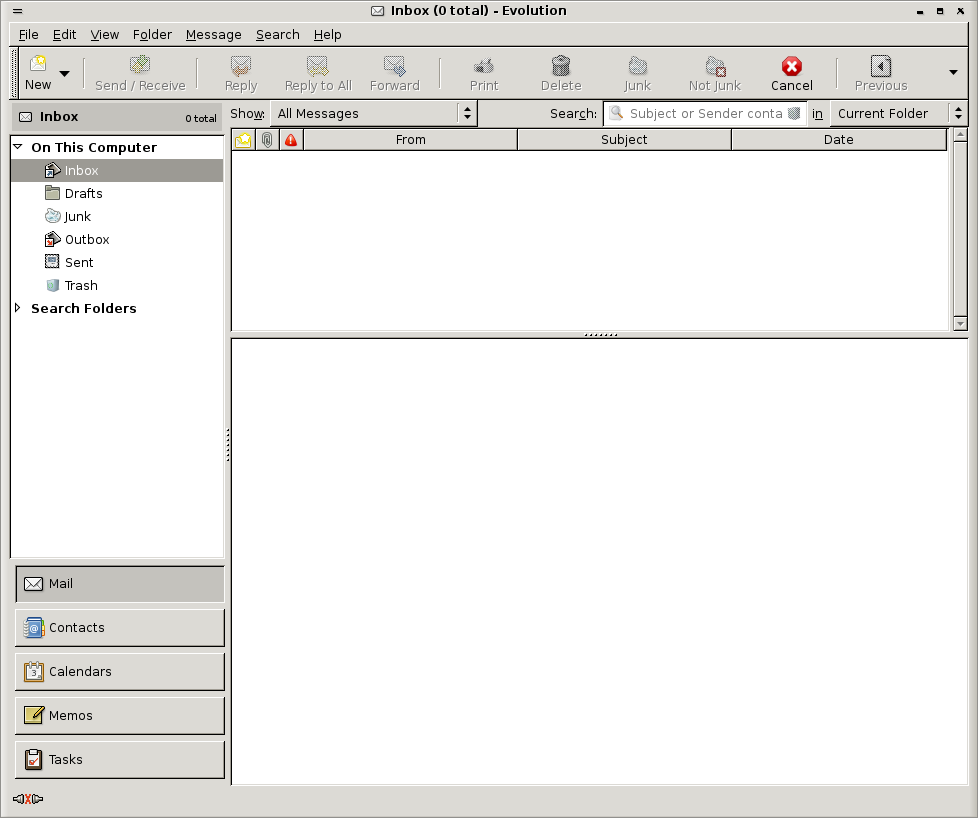 We can start up Evolution from the Applications menu on the top GNOME panel. Using the left mouse button, click on the Applications menu, then click the Internet sub menu and then the Evolution Mail item. We then see the Evolution window as in Figure ??.